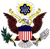 国徽:主体为一只胸前带有盾形图案的白头海雕(秃鹰)。白头海雕是美国的国鸟,它是力量、勇气、自由和不朽的象征。盾面上半部为蓝色横长方形,下半部为红、白相间的竖条,其寓意同国旗。鹰之上的顶冠象征在世界的主权国家中又诞生一个新的独立国家——美利坚合众国;顶冠内有13颗白色五角星,代表美国最初的13个州。鹰的两爪分别抓着橄榄枝和箭,象征和平和武力。鹰嘴叼着的黄色绶带上用拉丁文写着“合众为一”,意为美利坚合众国由很多州组成,是一个完整的国家。